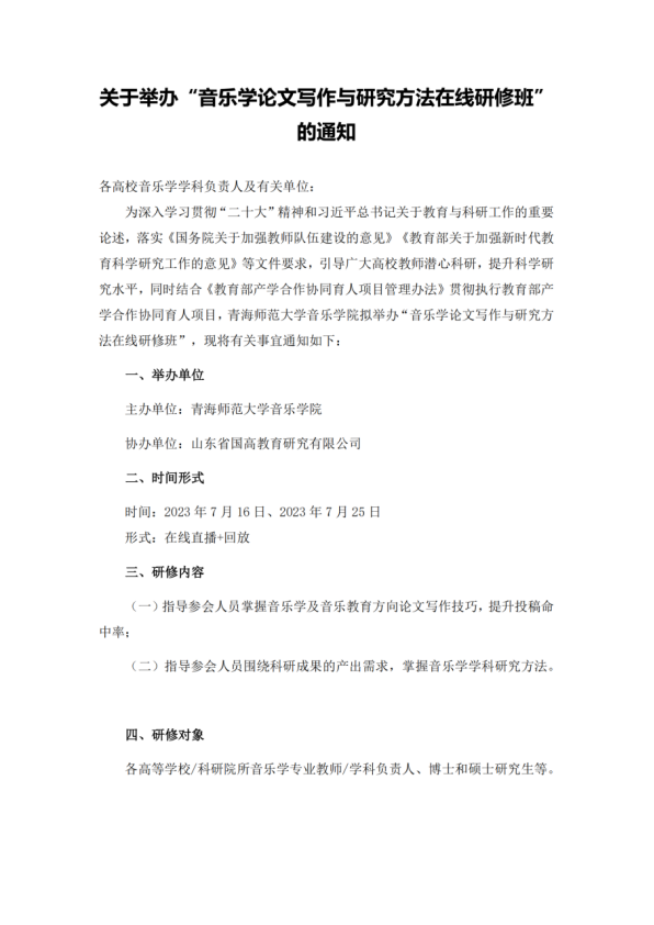 关于举办“音乐学论文写作与研究方法在线研修班” 的通知