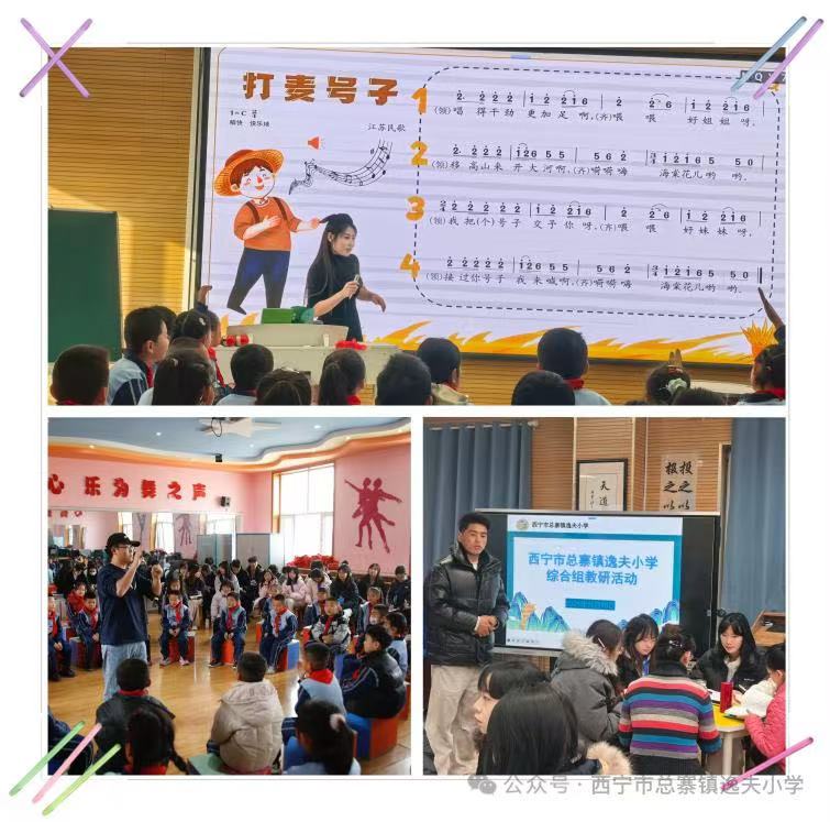 图2:逸夫小学音乐教师乔宇飞鸿、王怀兰和王国仙三位老师分别呈现了《洋娃娃和小熊跳舞》、《打麦号子》和《丰收的节日》三节音乐研讨课。