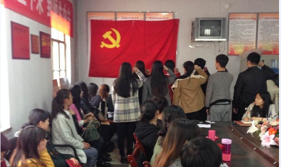 宣誓仪式由四部分组成,首先进行了庄严的奏《国际歌》仪式;随后由李超同志宣读预备党员名单并领誓,除毕业班实习的预备党员外,在校的9名同学参加了宣誓仪式;接着崔晓晓同学代表新入党党员发言、马世伟同学代表老党员发言;最后王金锐副主任做了总结讲话。